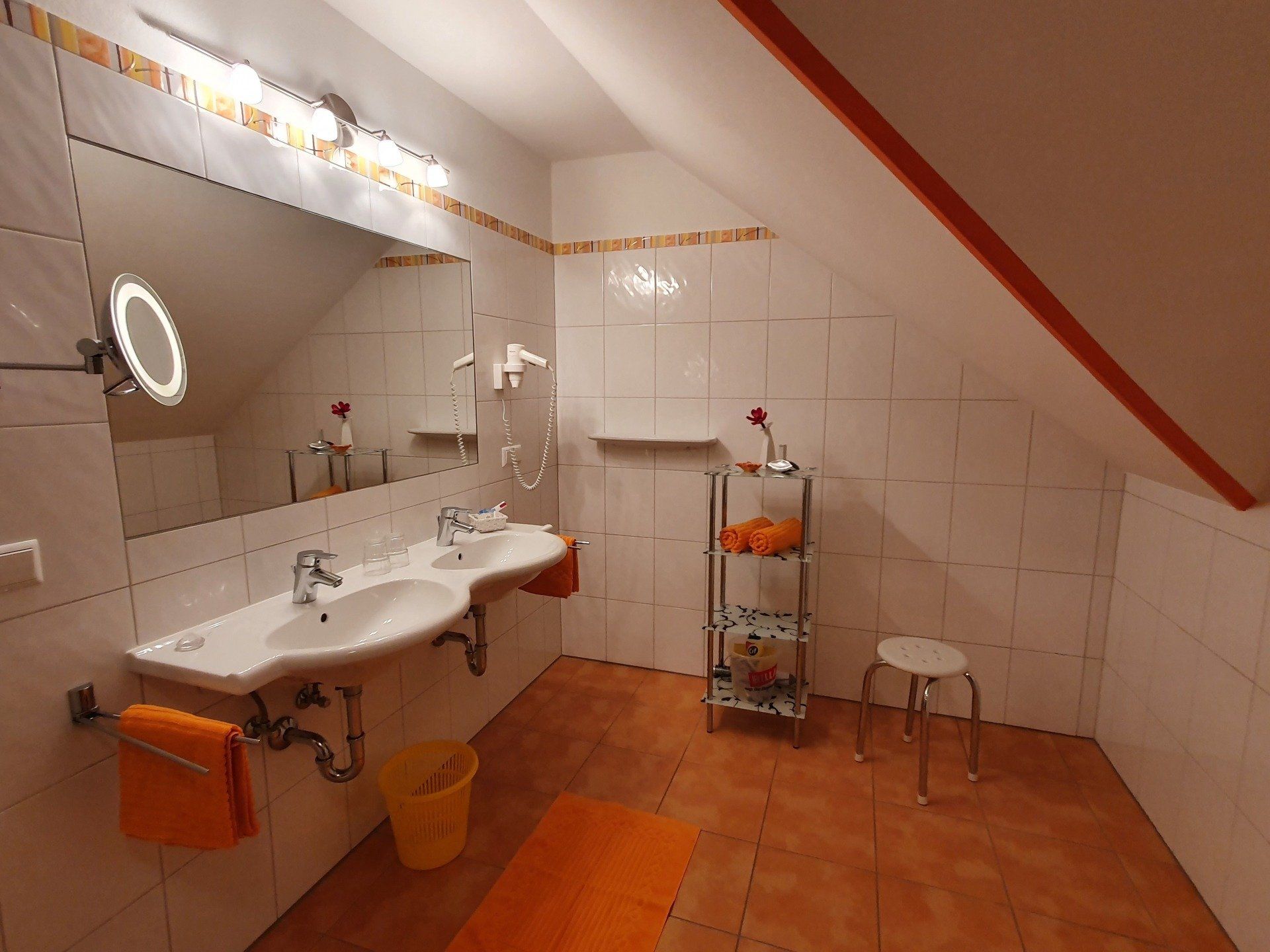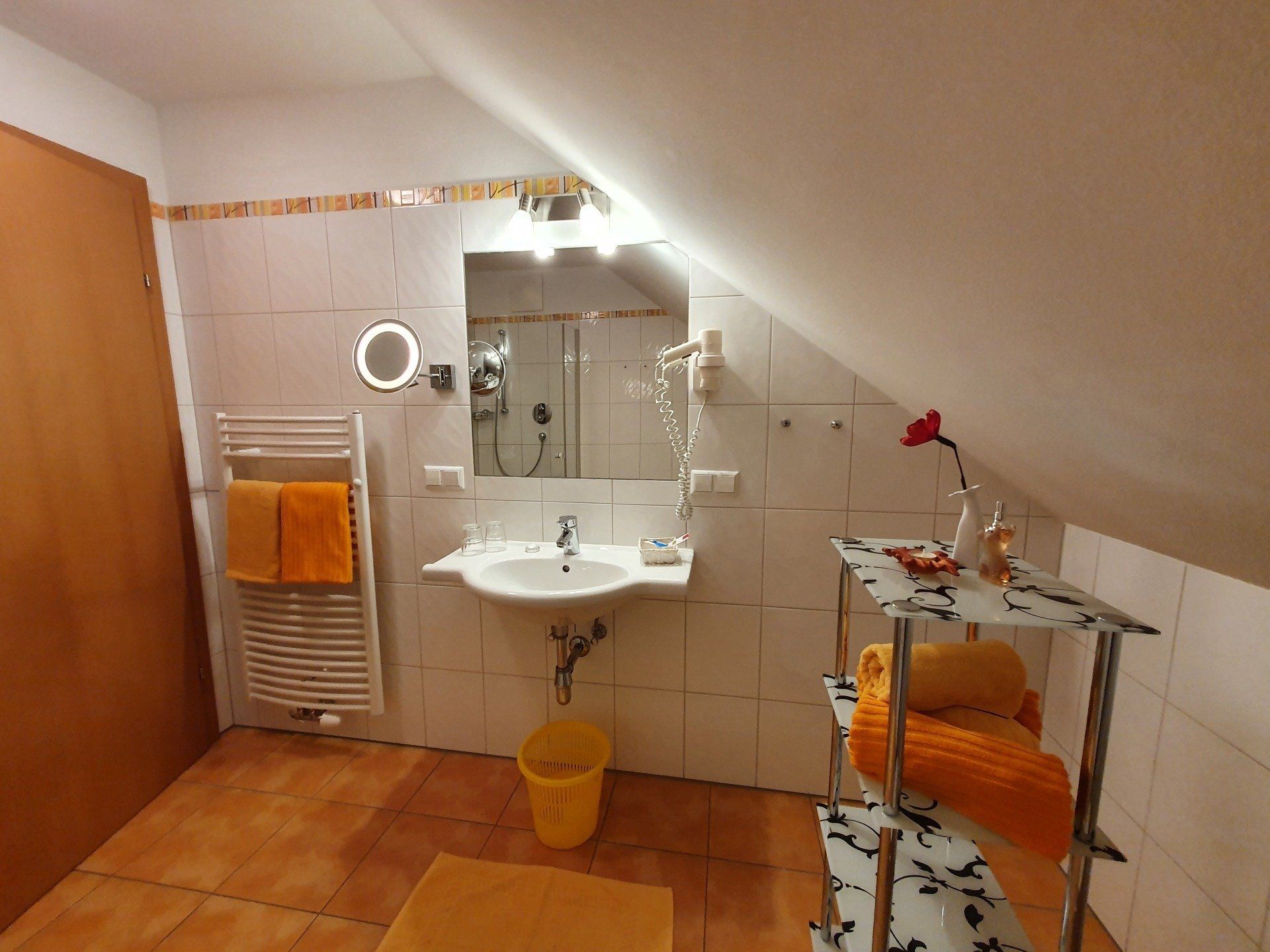 separate Dusche, Fön, Kosmetikspiegel und  WC